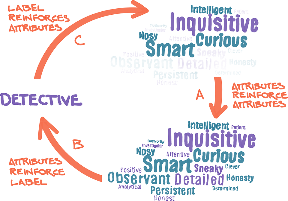 This third mode of reinforcement consists of “a label reinforcing the attributes.” The presence of the label brings to mind specific attributes and behaviors. See arrow C in Figure 4.