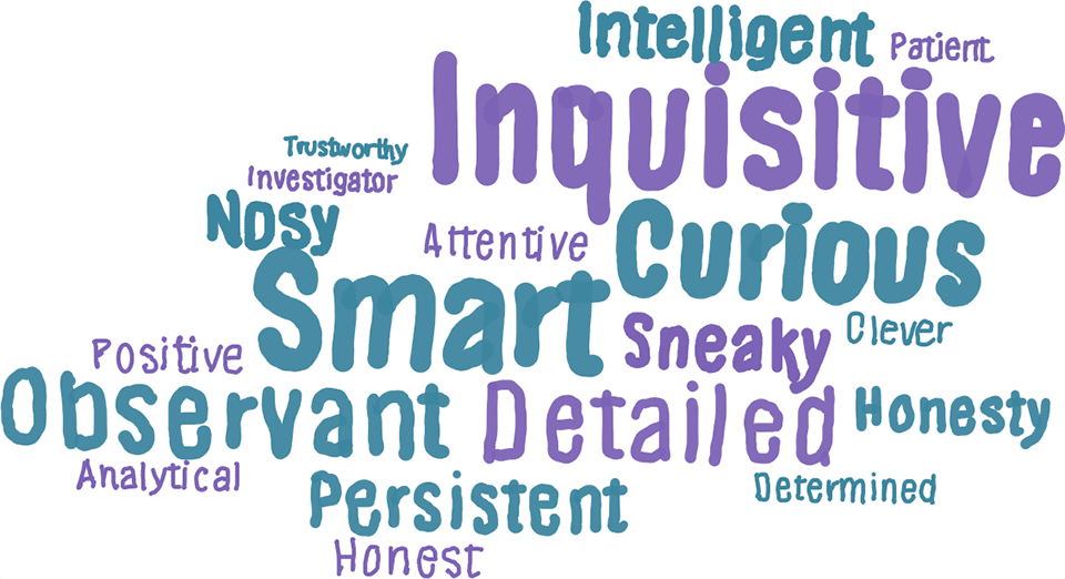 Figure 7. This word cloud shows some of the answers to the question: What attributes would you associate with a person who is a detective? The most common answers are shown here.