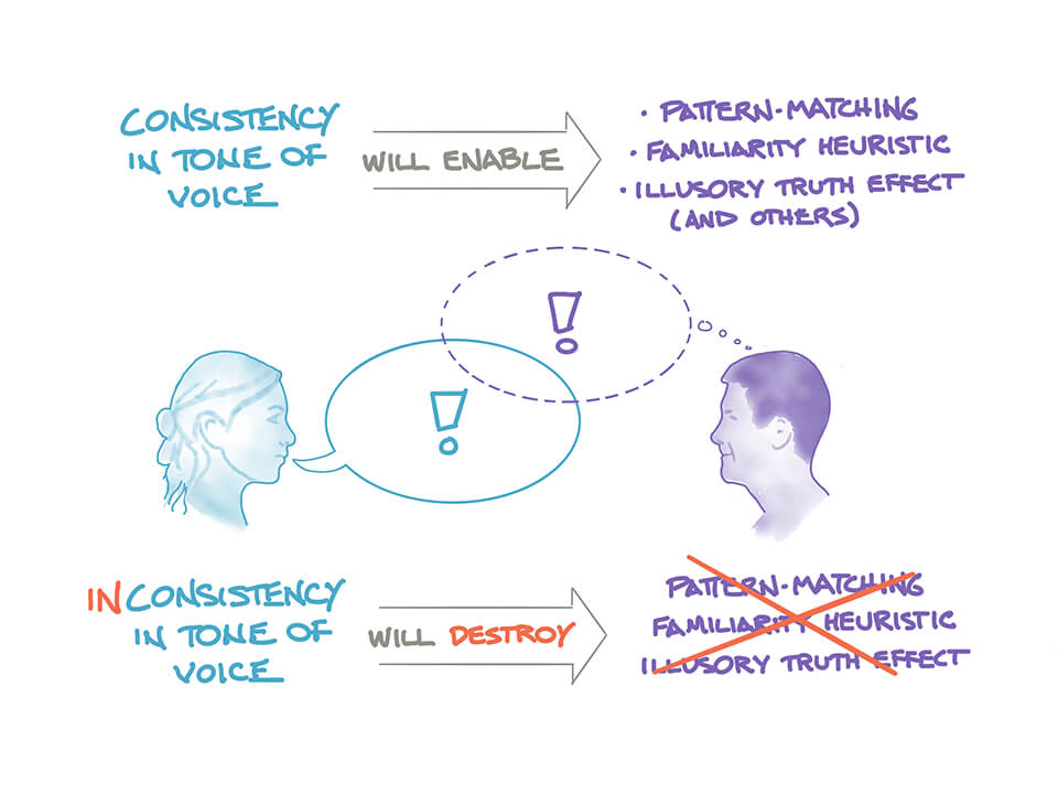 Figure 2. Inconsistency in tone of voice will negate any possible effects from our audiences’ pattern matching abilities, and other mechanisms, such as the familiarity heuristic, the illusory truth effect, and the other biases and heuristics that enable our audiences to complete our marketing messages for us.