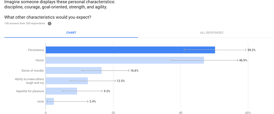 Imagine someone displays these personal characteristics: discipline, courage, goal-oriented, strength, and agility. What other characteristics would you expect? Please select all that apply: