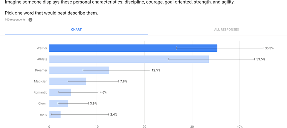 It’s worth noting that this experiment reveals the “blurring” I spoke about earlier. Both the Warrior and the Athlete share many characteristics, and respondents chose almost equally the labels that share these attributes.